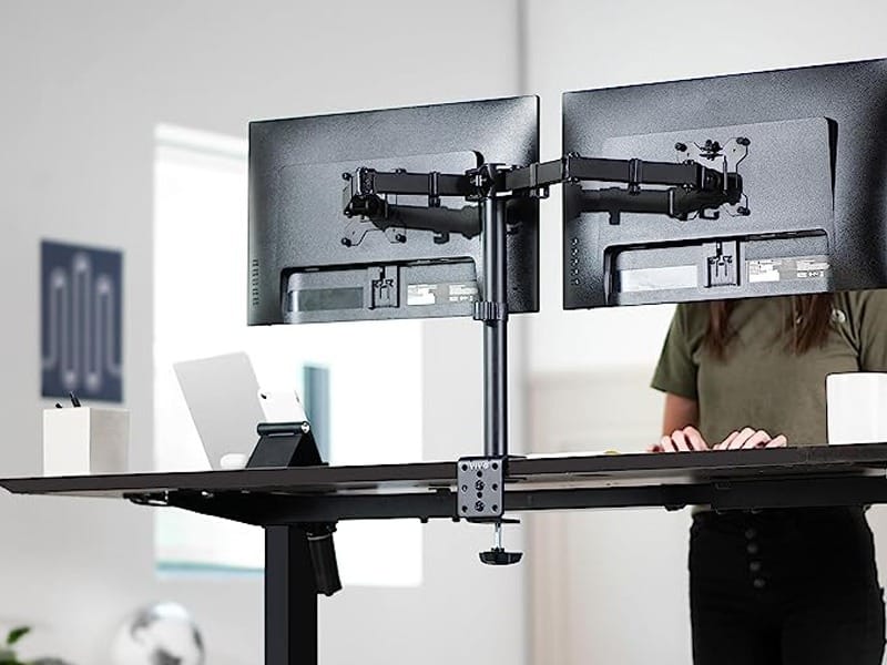This 2 Monitor Mount lifts your displays off the desk, freeing up valuable space for your keyboard, mouse, and other tools. It transforms a cluttered table into a minimalist and efficient workstation.
